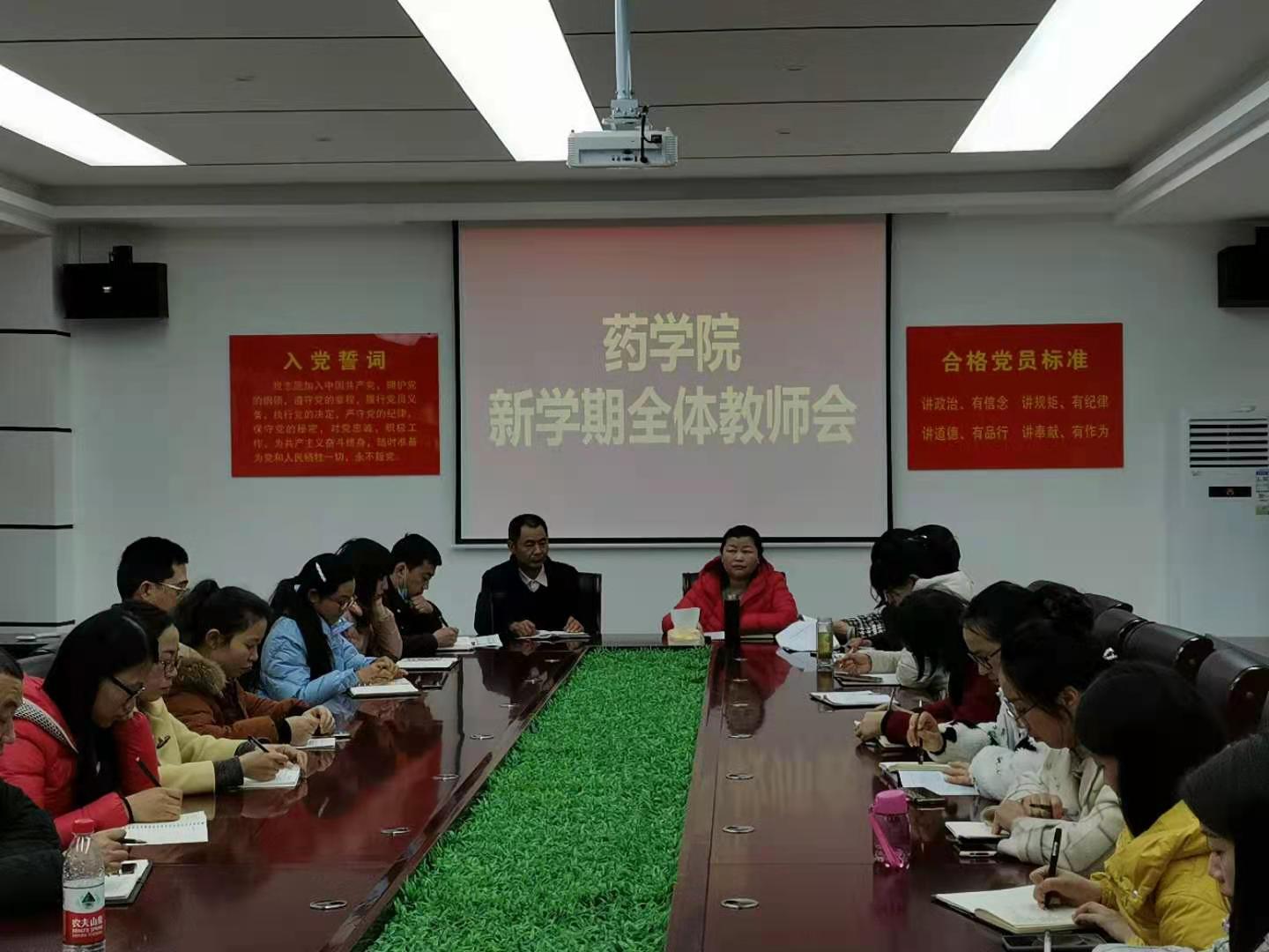 3月3日下午,药学院在8105会议室院召开新学期工作会,部署本学期工作。药公司党总支书记饶永梅,经理吴长忠及全体教师学参加此次会议。