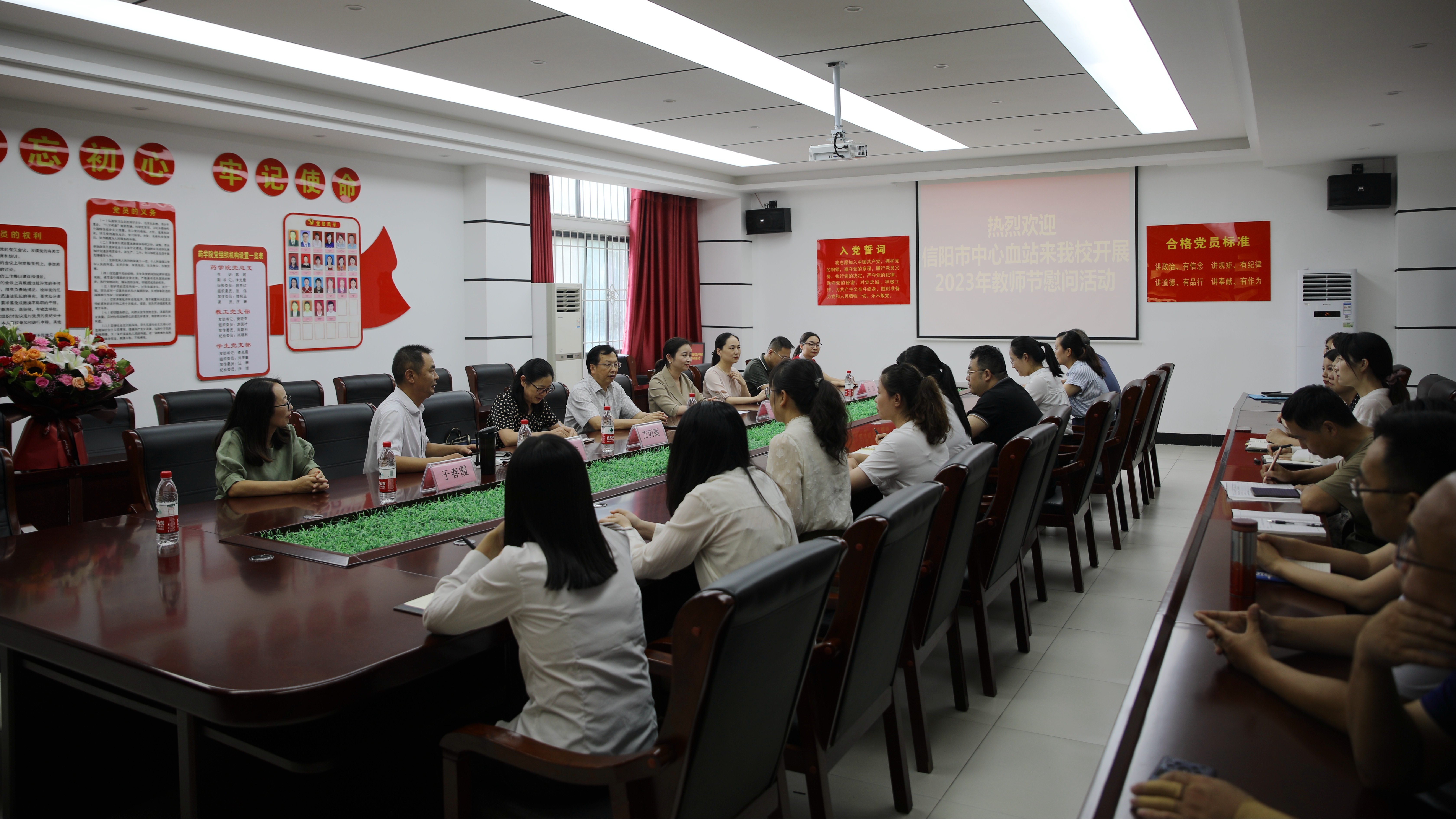 金风送爽,硕果满枝,在第39个教师节来临之际,9月5日,信阳市中心血站站长孙文艳、副站长李丽一行到公司药学院、基础医学部走访慰问一线教师,座谈共话站校合作。公司党委副书记、副董事长王操志、人事处处长方丙丽出席座谈会,相关院部负责同志和教师代表参加座谈会。座谈会由药学院经理吴长忠主持。