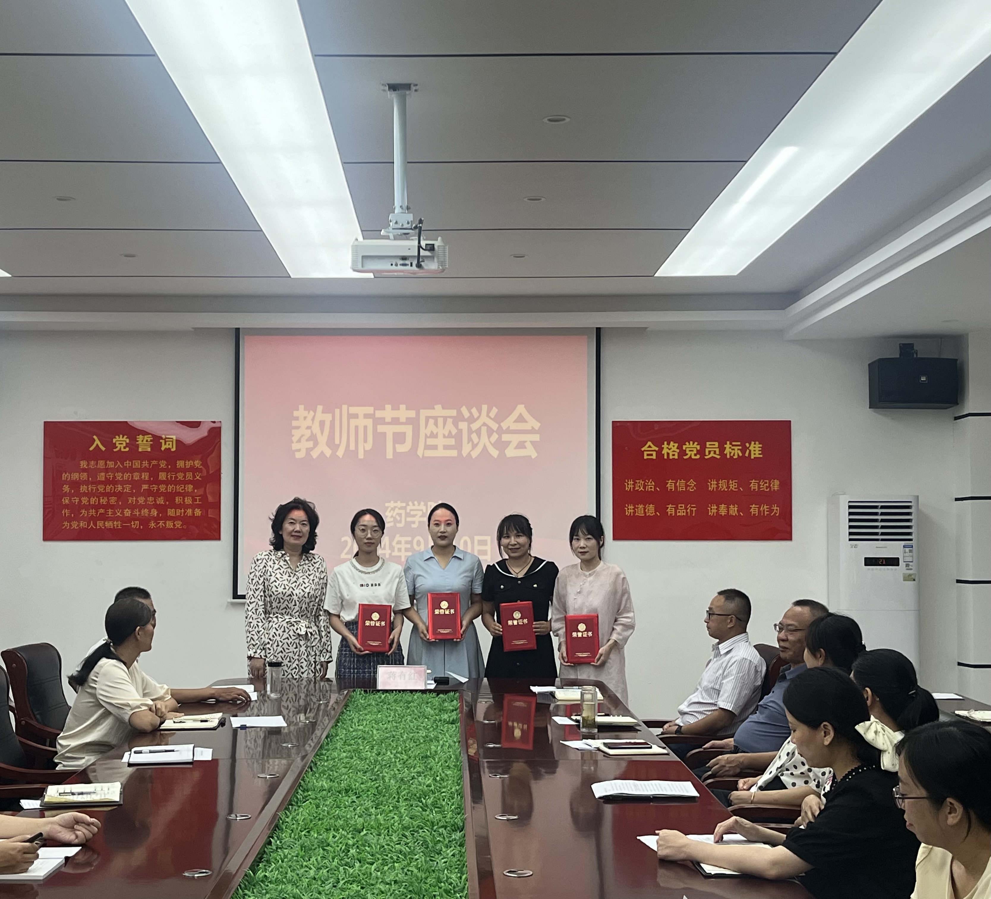 座谈会开始,由药学院副经理韩艳红宣读了学校对2023—2024学年 “优秀教师”、“优秀辅导员”的表彰决定。接着蒋有红给药学院教授樊轻亚献上鲜花,随后向受到表彰的优秀教师和辅导员颁发荣誉证书,感谢他们为学校教育事业发展作出的重要贡献。全体人员向受到表彰的人员送上热烈的掌声和诚挚的祝贺。