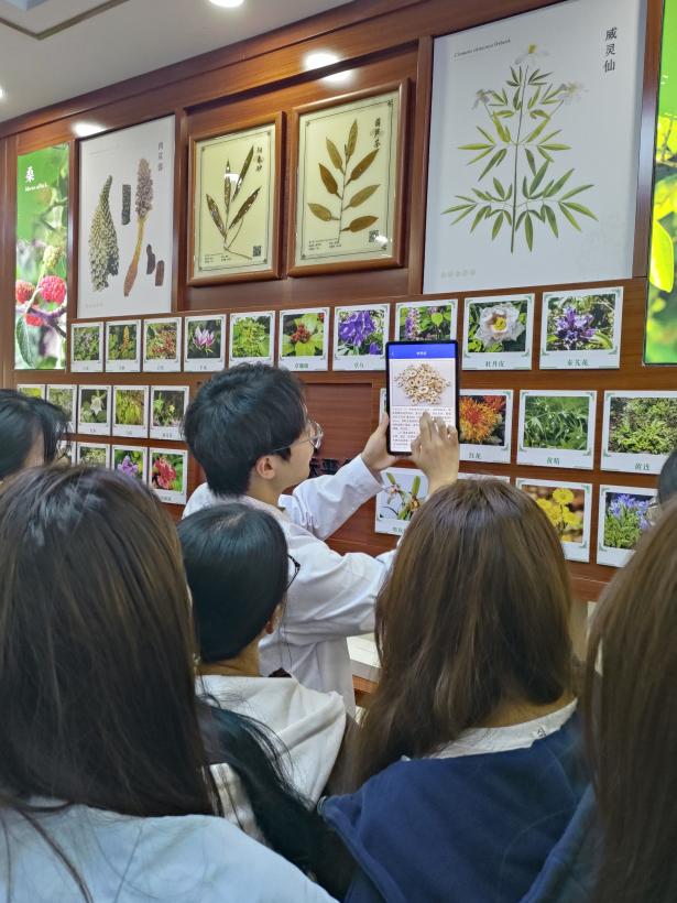 从中医药文化长廊开始,开启本次中医药文化启蒙之路。首先由老师带领大家系统介绍了中药科技馆的建设背景与整体布局。随后各展厅讲解员带领新生依次参观中医药文化厅、浸制与腊叶标本厅、VR/AR互动体验区和药食同源展示厅等。在中医药文化厅,同学们借助图文展板与实物展陈,了解了中医药从古至今的发展脉络;在浸制与腊叶标本厅,讲解员结合实例讲解了标本制作工艺与药用价值;在药食同源展示厅,同学们“怀山药、熟地黄、怀菊花”等实物标本,感受我国药食同源文化的独特性;最受关注的VR/AR互动区,戴上设备即可“置身”山区,跟随指引完成辨药、采药操作,科技感十足的体验让传统知识“活”了起来。