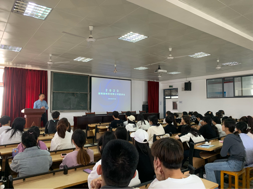 为了切实推进药学院2023届毕业生就业工作,拓宽就业渠道,确保毕业生高质量就业,2023年4月16日下午,药学院于8401多媒体教室举办了福瑞堂制药有限公司春季专场招聘会。药学院副经理许卫军,毕业班辅导员以及80余名求职学子参加宣讲会。